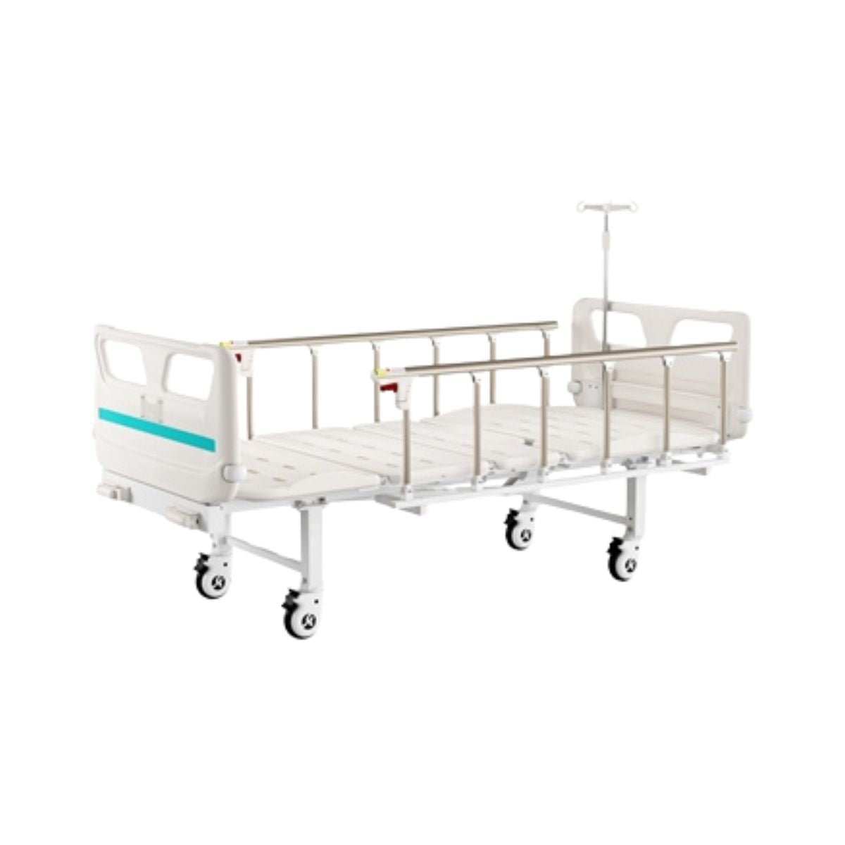 Letto ospedaliero a 3 snodi regolabili in altezza mediante l'uso di 2 manovelle di Gima. Letto da degenza con 4 rotelle e sponde laterali in lega di alluminio con 6 sbarre. Portata max 200kg.
