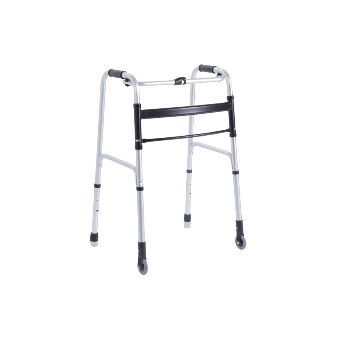 Girello per anziani pieghevole in alluminio regolabile in altezza. Moretti serie Mopedia RP735. Deambulatore con due ruote fisse e due puntali in gomma.
