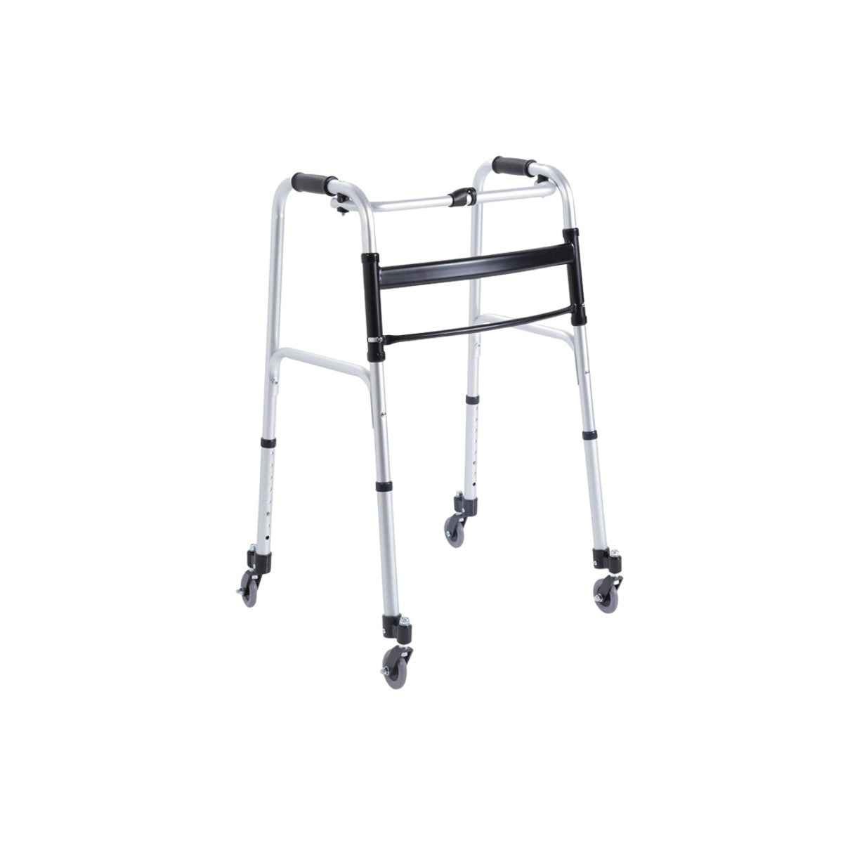 Deambulatore pieghevole costruito in alluminio anodizzato leggero con manopole imbottite, dotato di 4 ruote piroettanti.
