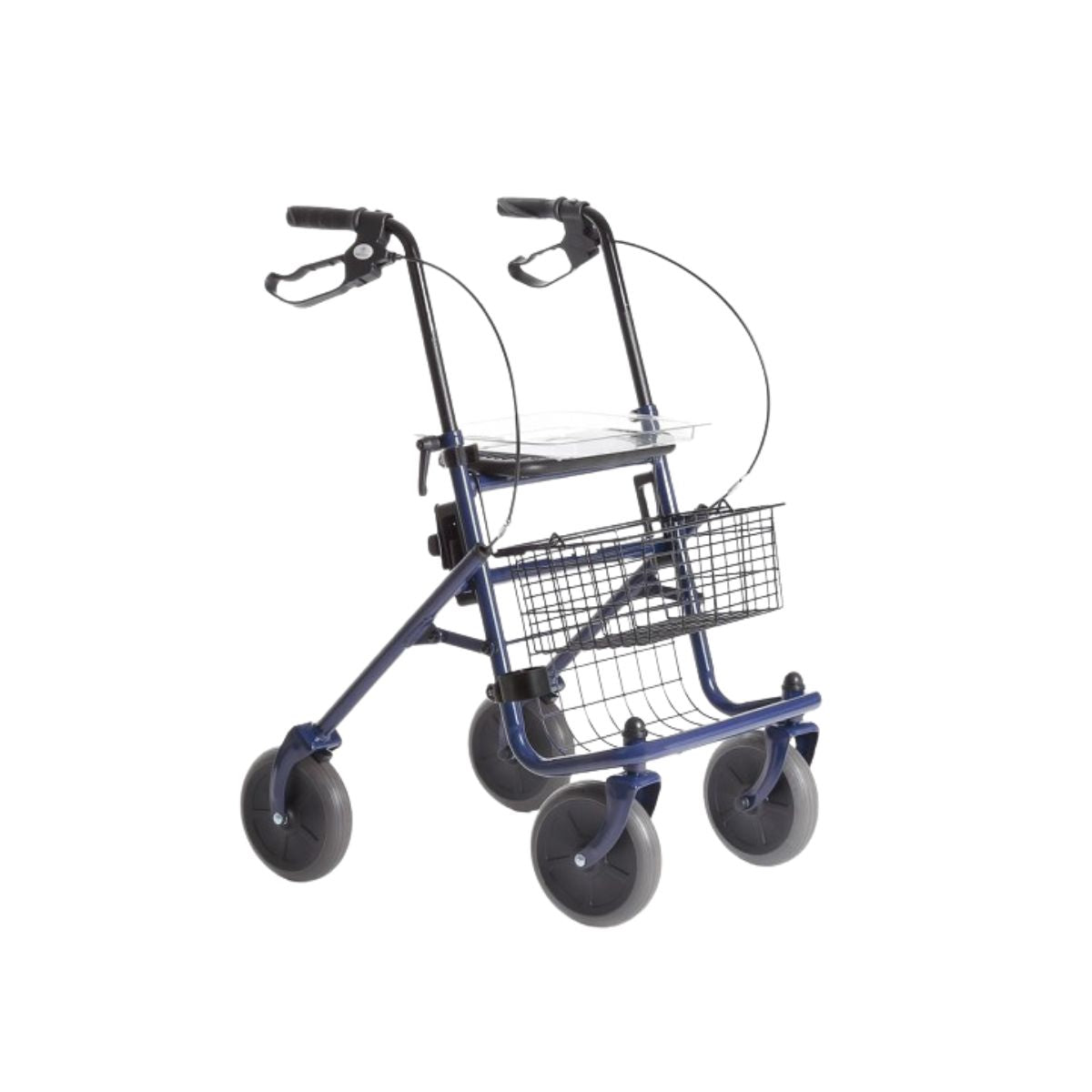 Deambulatore rollator in acciaio a 4 ruote, 2 fisse e 2 piroettanti. Moretti mod. Dyone RP690B. Girello per anziani con sedile, vassoio e cestino portaoggetti