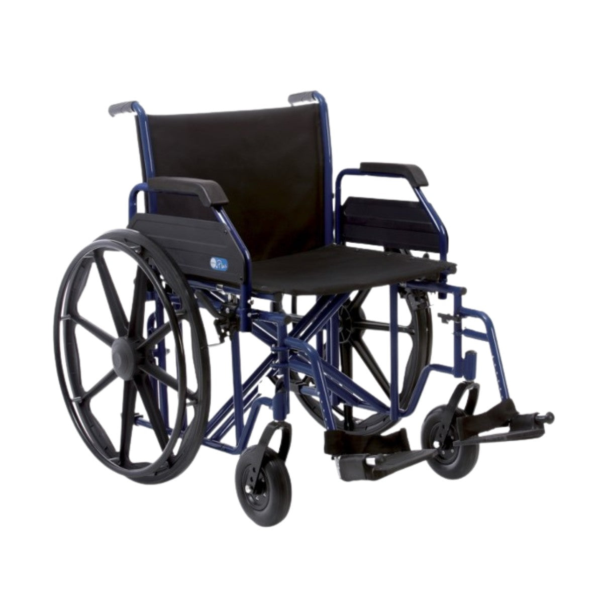 Sedia a rotelle bariatrica per disabili e anziani Moretti Plus. Telaio a doppia crociera con braccioli corti ribaltabili e pedane estraibili. Varie misure