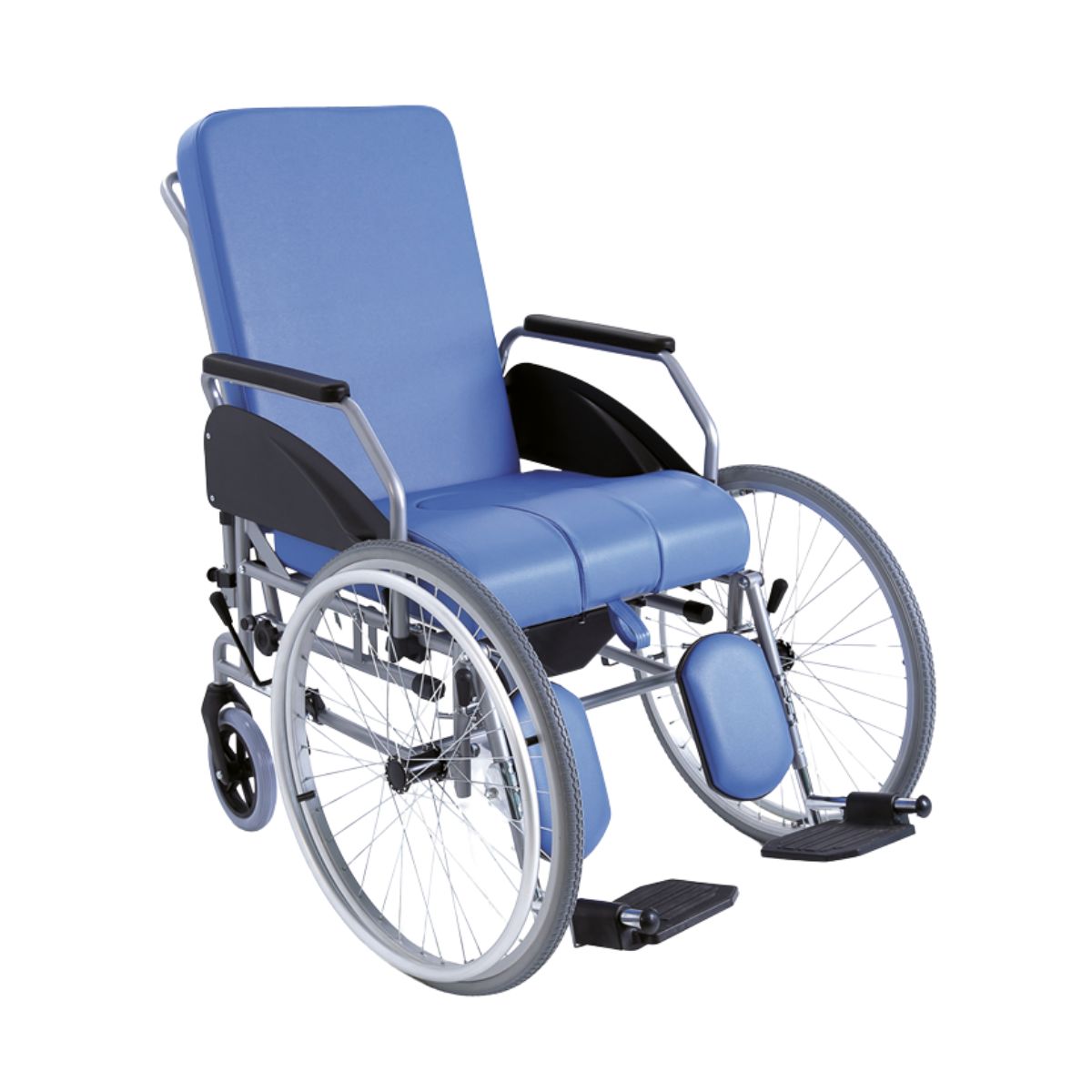 Comoda ad autospinta per anziani e disabili - Ruote grandi anteriori - WC Estraibile - Schienale estraibile e reclinabile - Dimensione seduta a scelta Sedia comoda a telaio rigido in acciaio verniciato a polveri. Schienale estraibile e reclinabile da 0° a 45° con ritorno semi automatico a molla. Seduta e schienale anatomici e rimuovibili senza utensili. Rivestimento in similpelle blu e imbottitura ignifughi testati secondo norma EN 1021-1 e EN 1021-2. Poggiapiedi e poggia polpacci regolabili in altezza e ribaltabili lateralmente. Pedane elevabili ed estraibili lateralmente. 2 ruote Ø 60cm con freno a lamina e 2 ruote piroettanti Ø 20cm. WC estraibile e lavabile. Ausilio per evacuazione e mobilità destinato a persone con difficoltà di deambulazione . Classe di dispositivo 93/42 Classe I Codice GMDN 41619 Codice Classificazione CND Y122106 Repertorio dei Dispositivi Medici 1947672 Codice nomenclatore DM 332/99 12.21.09.003 Codice nomenclatore DPCM 12.01.2017 09.12.03.012 Norma tecnica di riferimento UNI EN 12182 Resistenza al fuoco EN 10 21 -1/2