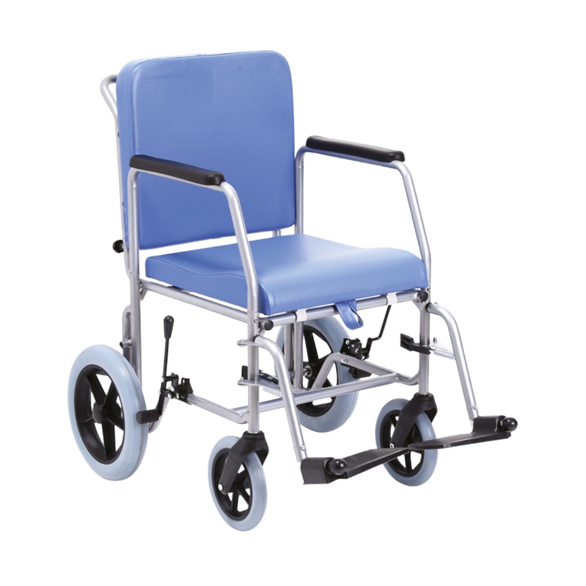 Comoda per disabili con braccioli imbottiti e ribaltabili. 2 ruote posteriori medie Ø 30cm con freno a lamina e 2 ruote anteriori piroettanti Ø 20cm.