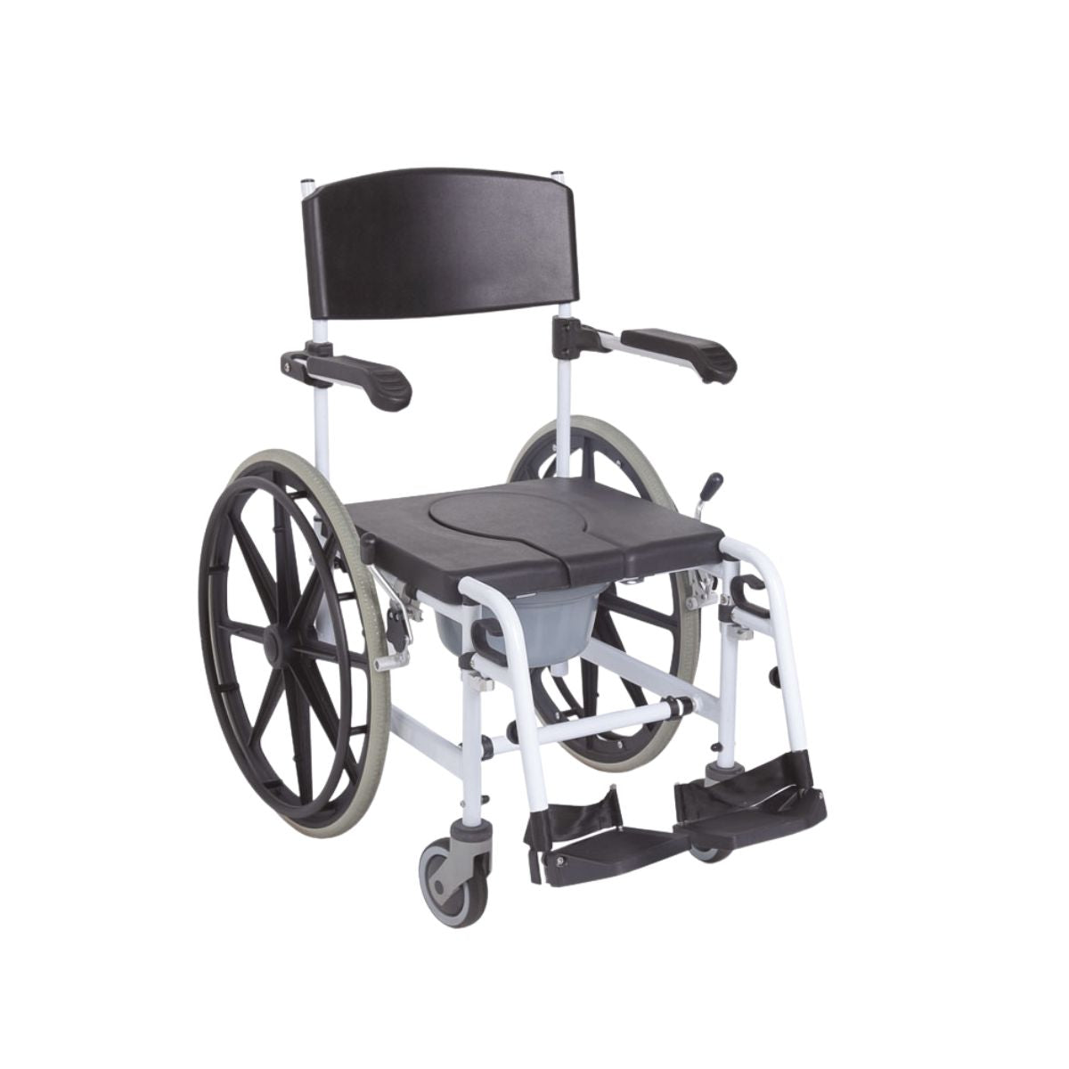 La sedia comoda wc è inoltre dotata di 2 ruote posteriori da 60 cm con sistema quick release. Le due ruote anteriori invece sono piroettanti con diametro da 12,5 cm.