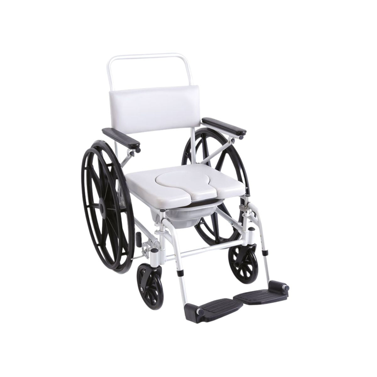 La sedia comoda wc è inoltre dotata di 2 ruote grandi posteriori da 62 cm. Le due ruote anteriori sono piccole con diametro da 20 cm.