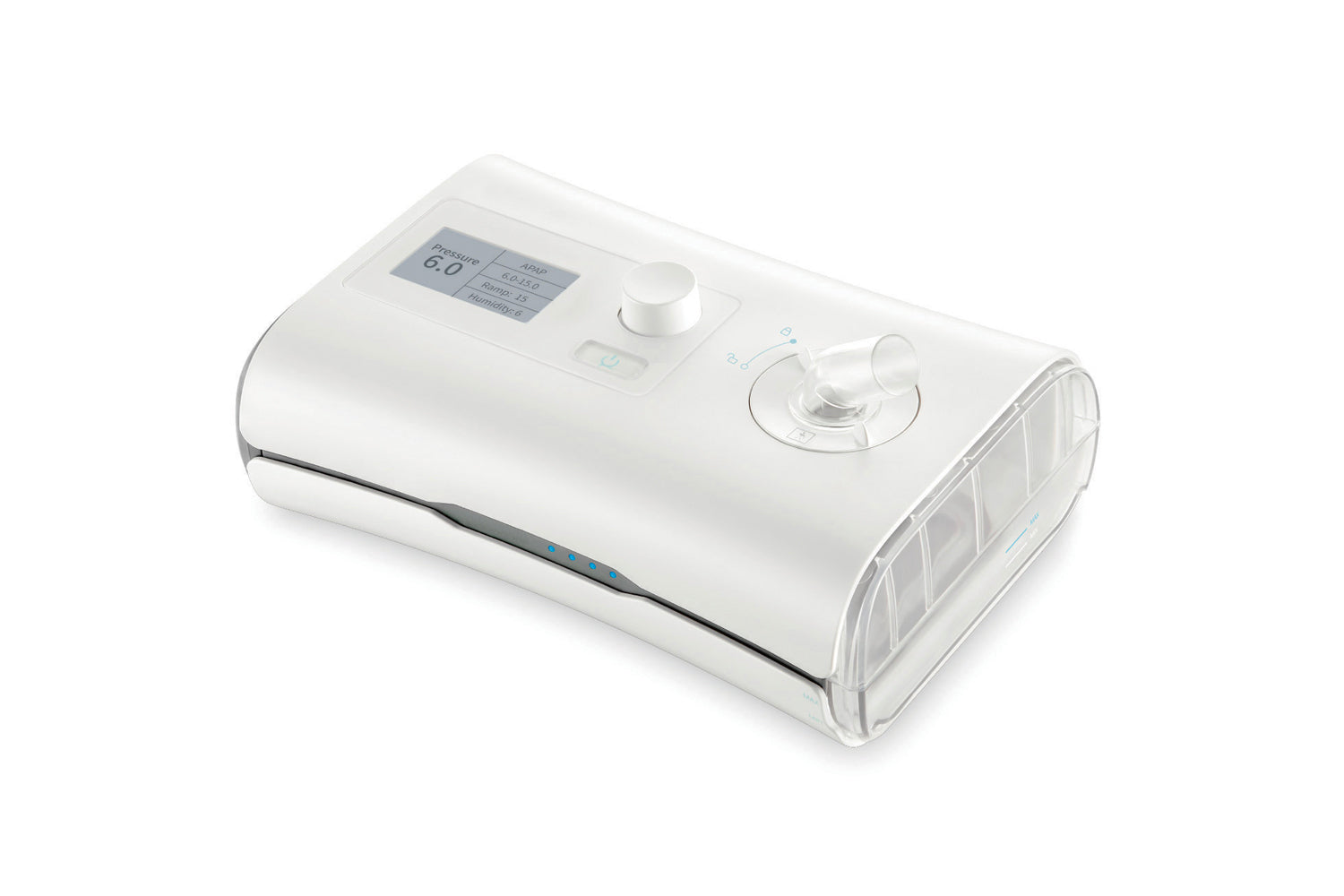 Umidificatore integrato per mitigare gli effetti indesiderati della terapia, quali la secchezza di bocca e naso. Micro-SD da 8 GB per memorizzare dati e informazioni dettagliate sulla terapia svolta e per permettere lo scarico dati su apposito software PC.