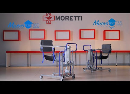Il Muevo HOME di Moretti è un sollevatore elettrico professionale progettato per il trasferimento e lo spostamento di anziani e disabili, con portata massima di 180 kg.